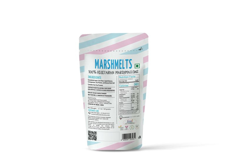 Marshmelts are fluffy, buttery, and chewy marshmallows, powdered with vanilla mist. 100% Vegetarian product with soy protein. No gelatin or animal fat. No preservatives. No artificial colours.
