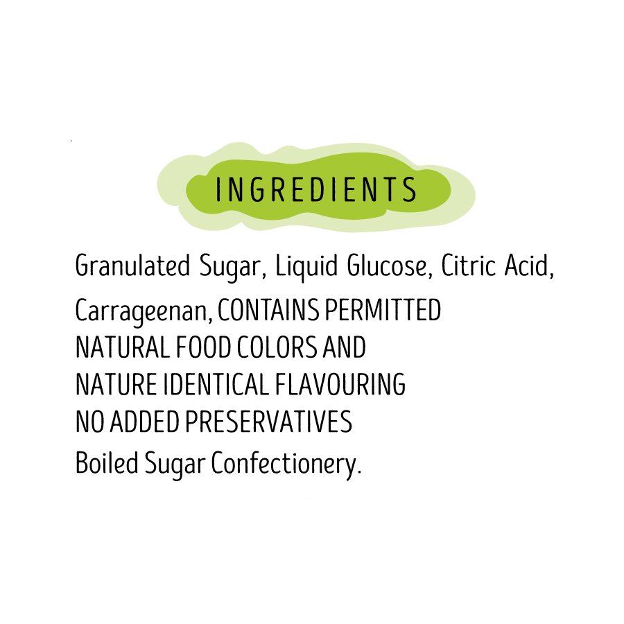 Ingredients:- Sugar, Glucose Syrup, Citric Acid, Edible Vegetable Oil. CONTAINS PERMITTED NATURAL FOOD COLOURS & NATURE IDENTICAL FLAVOURS. NO ADDED PRESERVATIVES. BOILED SUGAR CONFECTIONERY