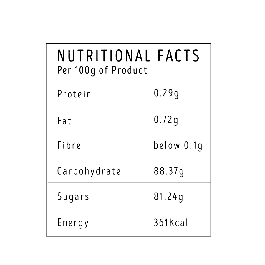 Nutrition Information (Per 100g of Product):- Protein nil ; Fat 1.8g ; Fibre nil ; Carbohydrate 89.99g ; Sugars 30.80g ; Energy 377 Kcal